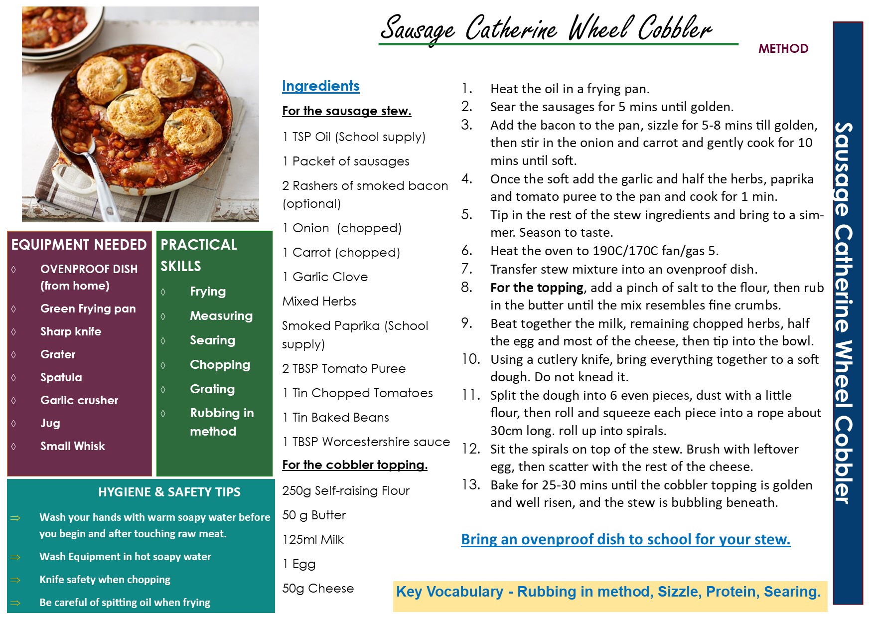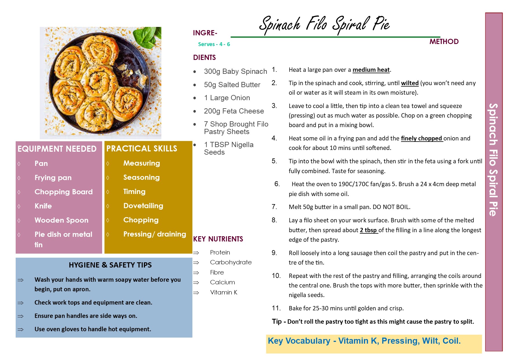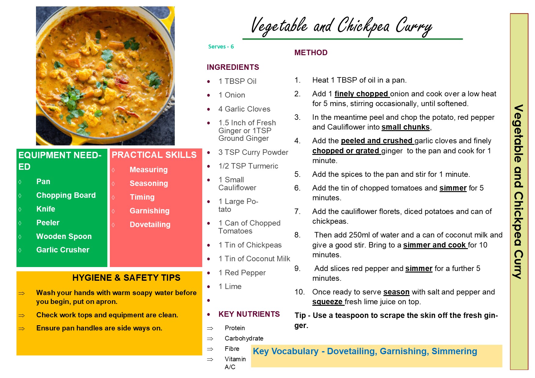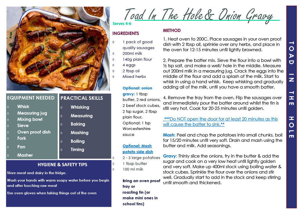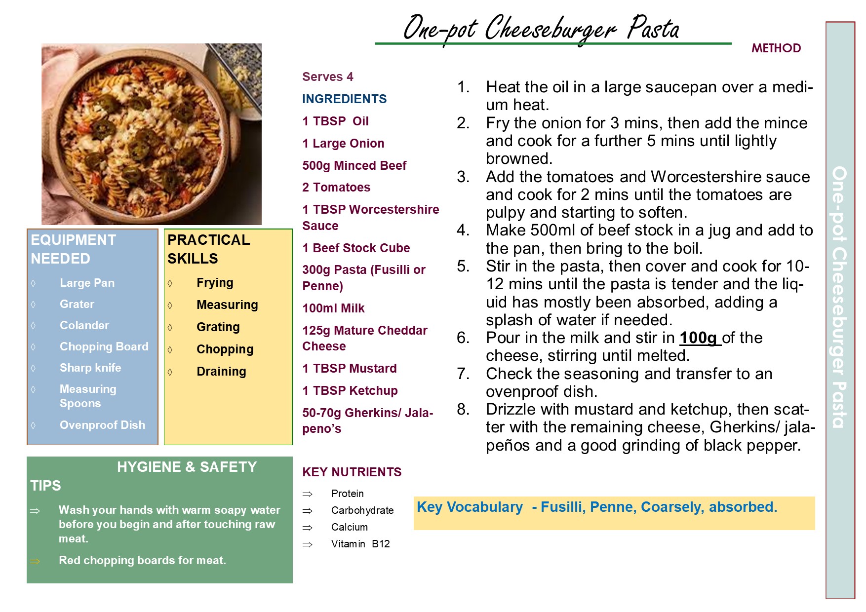 Students will study Food Technology for 40 lessons in year 8 and 9 on a rotation with other technology subjects. Practical cooking lessons will be once a week and students will be required to bring ingredients and an apron. During practical lessons students will prepare and cook a wide range of dishes which include a variety of traditional British (such as Shepherd’s Pie), foreign main meals (like Lasagne or Curry) and the occasional pudding! All are guaranteed to be delicious and will be enjoyed by families at home. Again, recipes can be seen below as a jpeg or as a PDF document at the bottom of the page.
