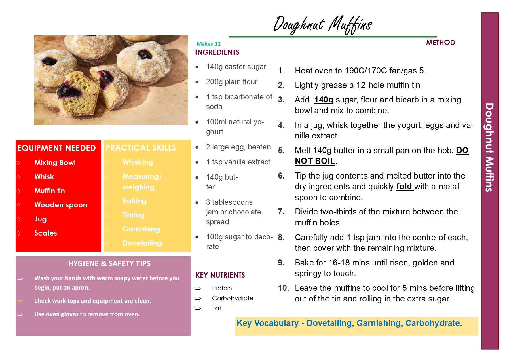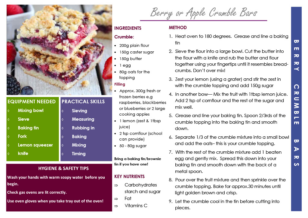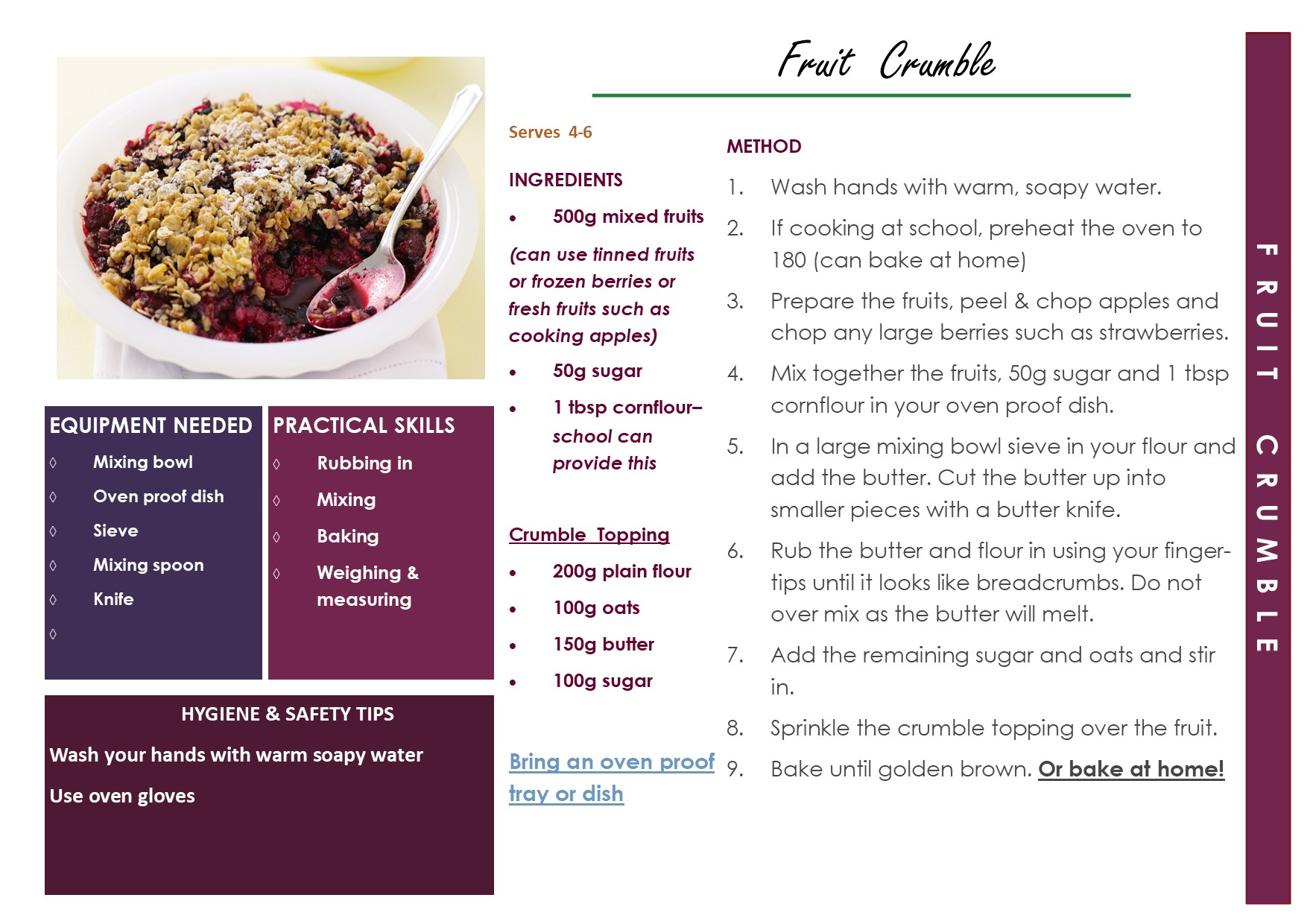 At the beginning of the course they will be given a recipe book and are asked to provide the necessary ingredients , a container and an apron for each practical lesson. The recipes can also be seen below and are also downloadable at the bottom of the page, should you wish to view this way or print a copy. In addition to developing their practical skills, pupils will learn about choosing a healthy diet and the importance of Food Hygiene.