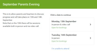 Step 2: Select Parents' Evening Click on the date you wish to book. Unable to make all of the dates listed? Click I'm unable to attend. |