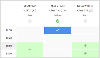 Step 6: Book Appointments Click any of the green cells to make an appointment. Blue cells signify where you already have an appointment. Grey cells are unavailable. To change an appointment, delete the original by hovering over the blue box and clicking Delete. Then choose an alternate time. You can optionally leave a message for the teacher to say what you’d like to discuss, or raise anything beforehand. Once you’re finished booking all appointments, at the top of the page in the alert box, press click here to finish the booking process. |