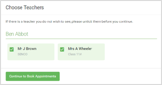 Step 5: Choose Teachers Select the teachers you’d like to book appointments with. A green tick indicates they’re selected. To de-select, click on their name. |